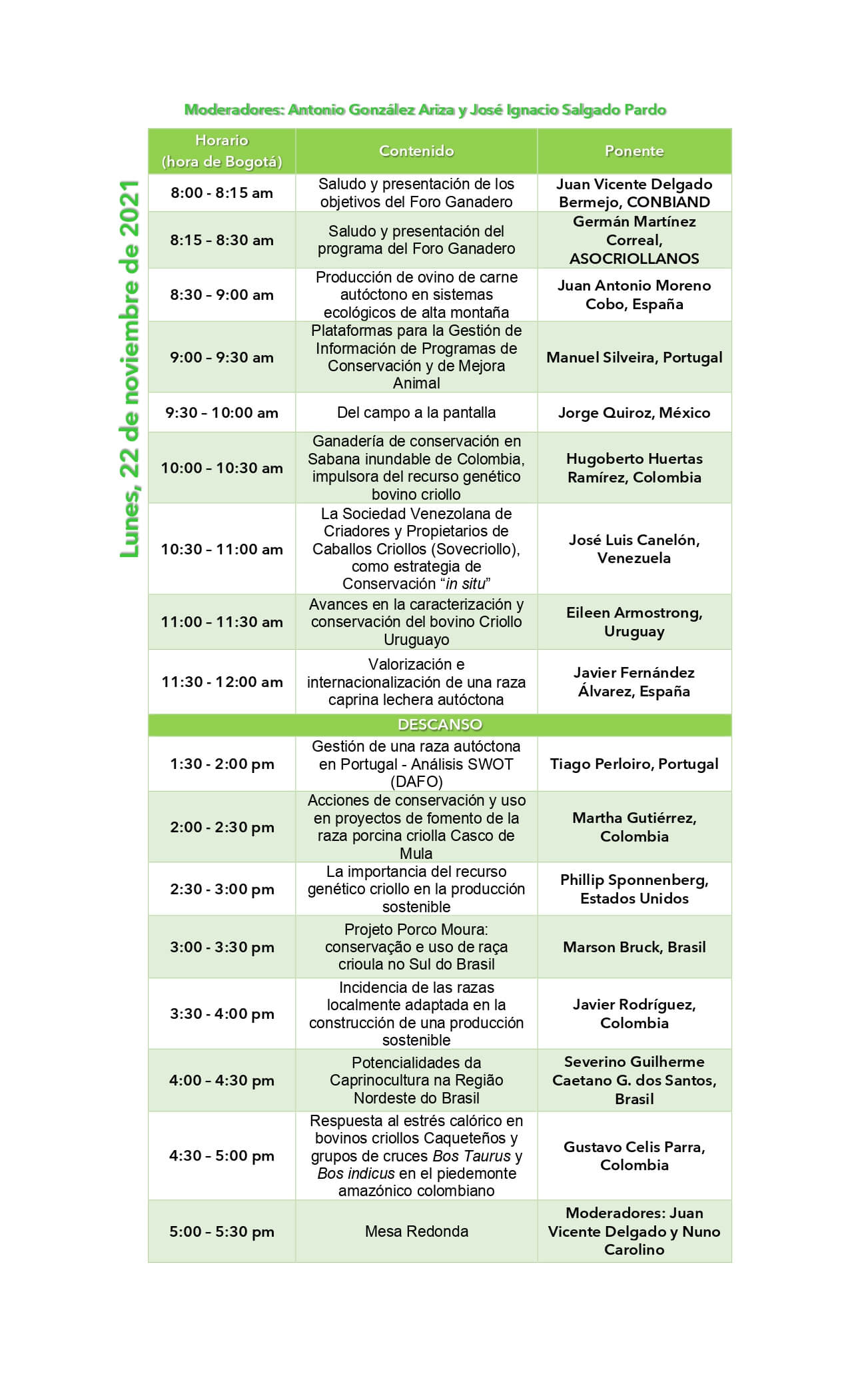 El programa contempla la participación de ganaderos de España, Portugal, Estados Unidos, México, Colombia, Venezuela, Brasil y Uruguay, quienes tratarán aspectos relacionados con la conservación y utilización sostenible de las razas locales (criollas) en distintos sistemas de producción: equinos, bovinos, porcinos, ovinos y caprinos de los países Iberoamericanos.