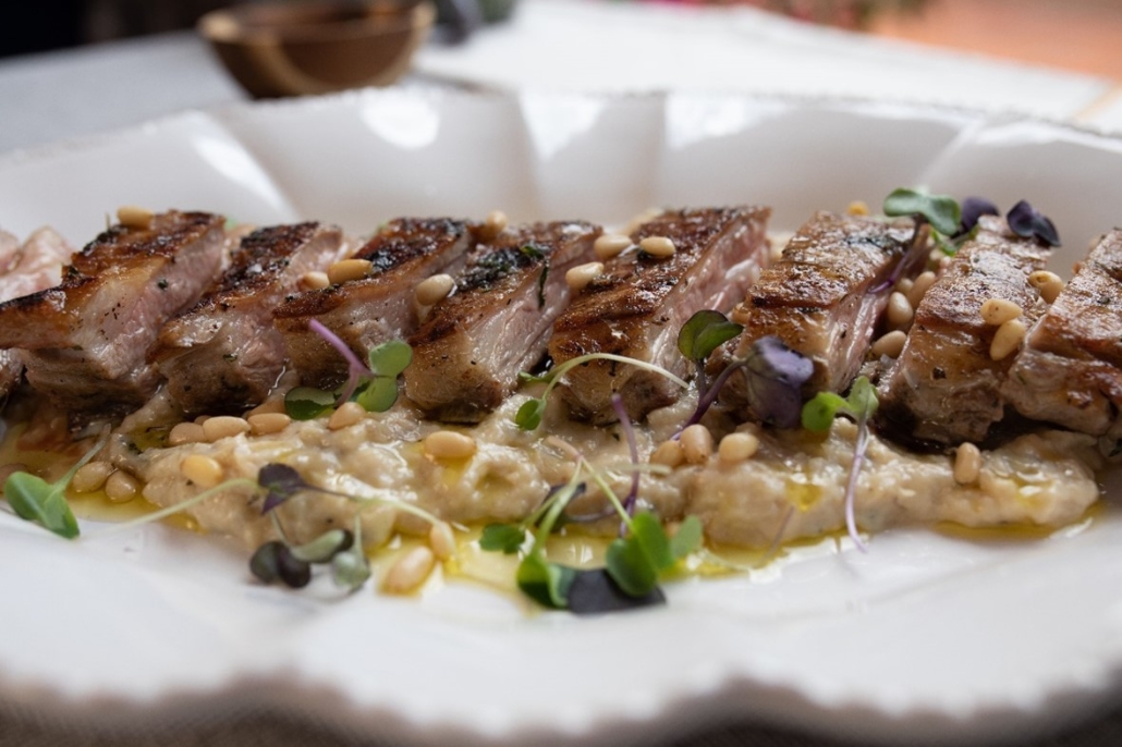 CHURRASCO DE CORDERO CON SALSA DE MENTA Y BABA GANOUSH