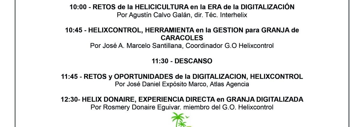 El programa abordará los principales retos y oportunidades que ofrece la digitalización al sector. La primera ponencia, titulada Retos de la helicicultura en la era de la digitalización, correrá a cargo de Agustín Calvo Galán, director técnico de Interhelix. A continuación, José A. Marcelo Santillana, coordinador del G.O. Helixcontrol, presentará la ponencia Helixcontrol, herramienta en la gestión para granja de caracoles, en la que se explicará el funcionamiento y utilidad de esta plataforma tecnológica.