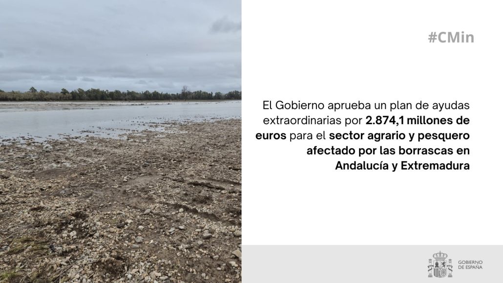 El Consejo de Ministros ha aprobado un plan de ayudas extraordinarias del Ministerio de Agricultura, Pesca y Alimentación con un presupuesto total de 2.874,1 millones de euros para los agricultores, ganaderos, pescadores y acuicultores de Andalucía y Extremadura, las comunidades autónomas más afectadas y con mayor siniestralidad por el tren de borrascas de gran intensidad producido en el último mes.