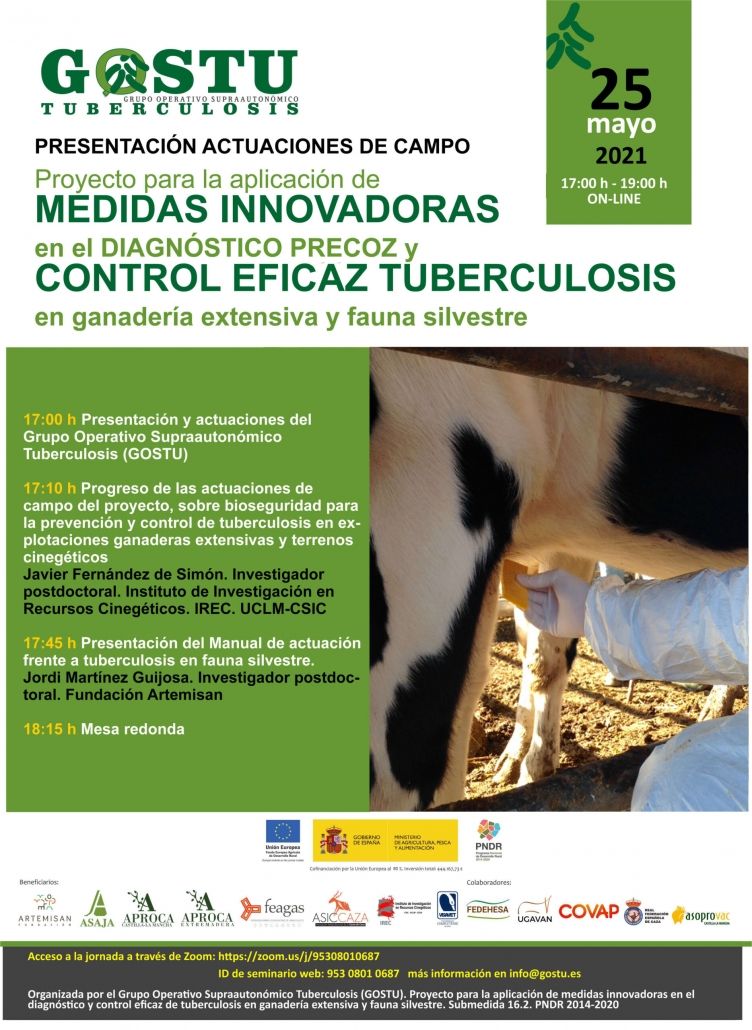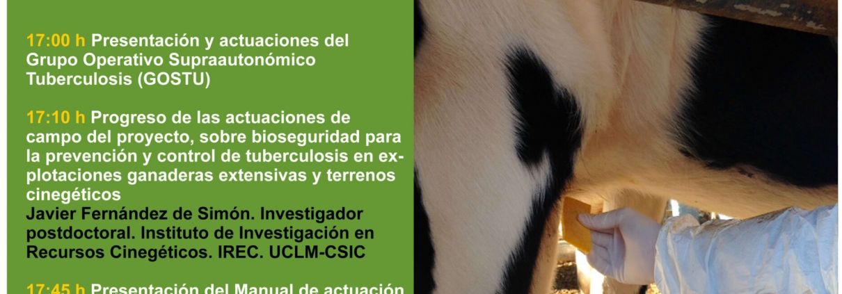 Mañana martes, 25 de mayo, a las 17:00 horas, el Grupo Operativo Supraautonómico Tuberculosis (GOSTU) presentará, de la mano de Javier Fernández de Simón, el progreso de las actuaciones de campo englobadas dentro del proyecto, que están centradas en las medidas de bioseguridad en las fincas piloto, tanto ganaderas extensivas como cinegéticas.