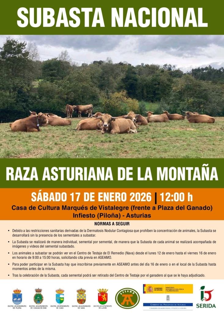 La Subasta Nacional de Sementales de raza Asturiana de la Montaña, inicialmente prevista para otra fecha, se celebrará finalmente el próximo 17 de enero en la Casa de Cultura de Infiesto (Piloña), tras su aplazamiento debido a las medidas de prevención ante la Dermatosis Nodular Contagiosa.