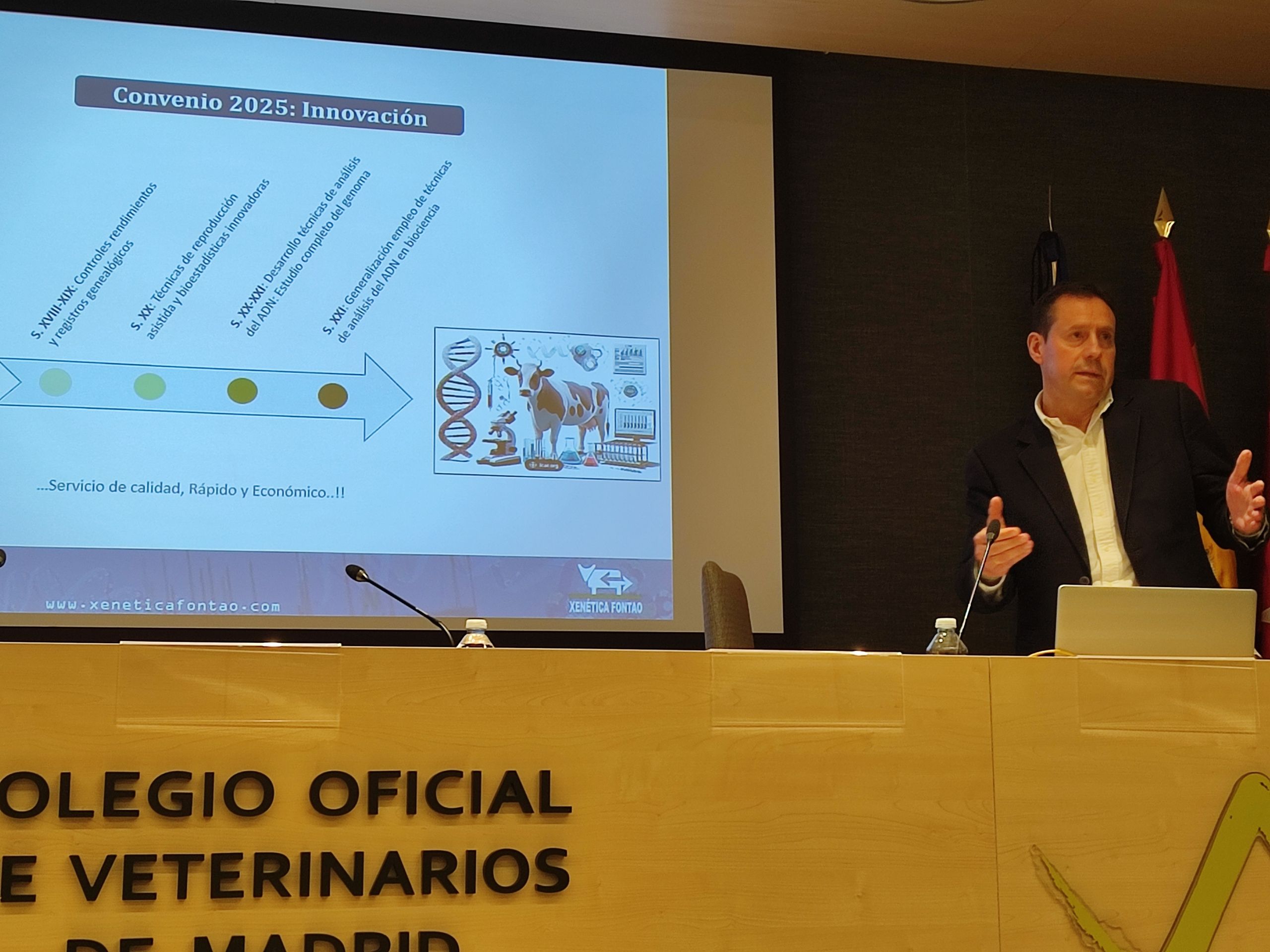 El profesor Óscar Cortés Gardyn, de la Universidad Complutense de Madrid, ofreció una conferencia titulada Explorando la Genómica, seguida de la intervención de Javier López Viana, de Xenética Fontao, que presentó los últimos avances en microarrays de ADN aplicados a razas puras.