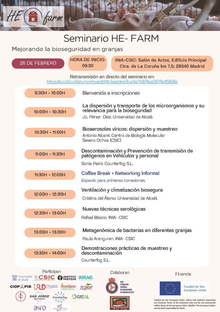 El proyecto europeo HE-FARM (Holistic Evaluation of FARM biosecurity) celebrará el próximo 26 de febrero un seminario técnico centrado en la mejora de la bioseguridad en explotaciones ganaderas, en el que se darán a conocer los principales resultados científicos y tecnológicos obtenidos a lo largo de su desarrollo. La jornada tendrá lugar en el INIA-CSIC (Madrid) y contará con la participación de investigadores, técnicos y empresas implicadas en el proyecto.