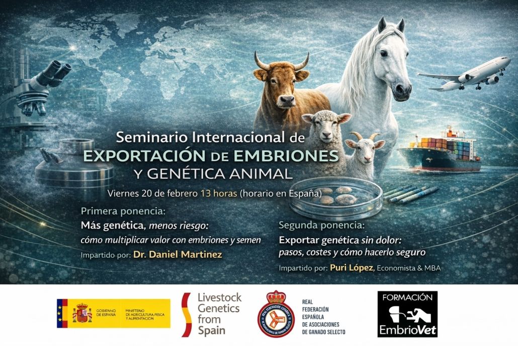 El próximo viernes 20 de febrero a las 13:00 horas (horario de España) se celebrará el Seminario Internacional de Exportación de Embriones y Genética Animal, un encuentro formativo centrado en las oportunidades y procedimientos para la internacionalización de material genético ganadero.